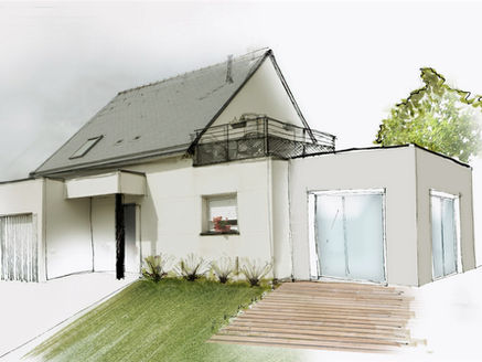 Cette extension de 22 m2 vient se greffer à une maison datant de 2014, située dans la campagne paimpolaise. Les deux grandes baies vitrées de la pièce de vie ont été supprimées, créant ainsi des passages vers la nouvelle extension, sans modifier les murs porteurs ou la structure du bâtiment. Ces deux mêmes baies vitrées ont été conservées pour s'intégrer dans l'extension, limitant ainsi le coût des travaux.